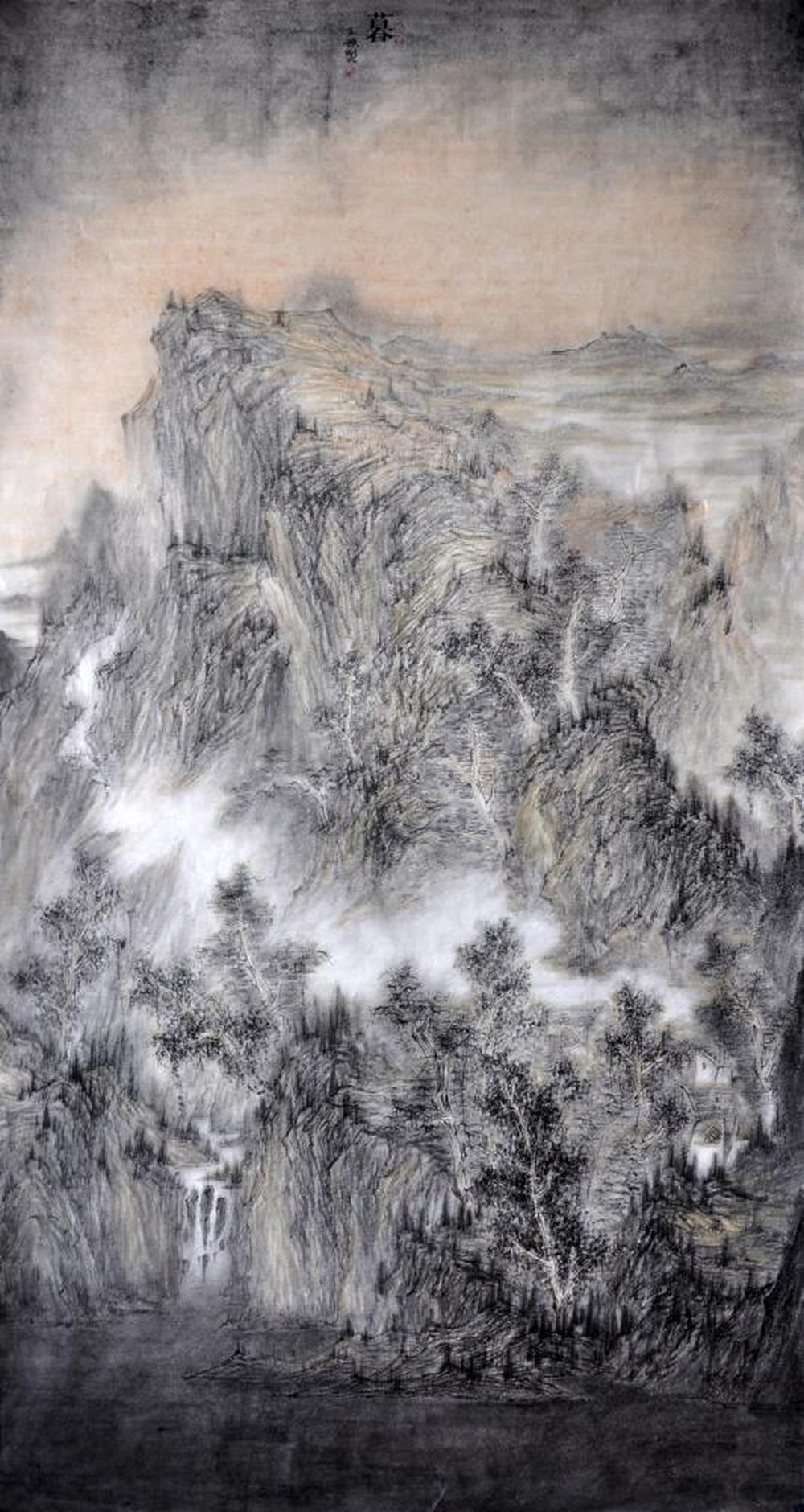 在这一片景色中,山石、树木、空气、河流相互交织,形成坚实凝练的整体印象。人们在欣赏作品的同时,很容易引起对有限画面之外无限风光的遐想与憧憬。在饱满充实的构图中,他用块面或者线条分割着山石林木,造成富有韵律和气势的山水胜境。峰峦叠嶂,美不胜收。